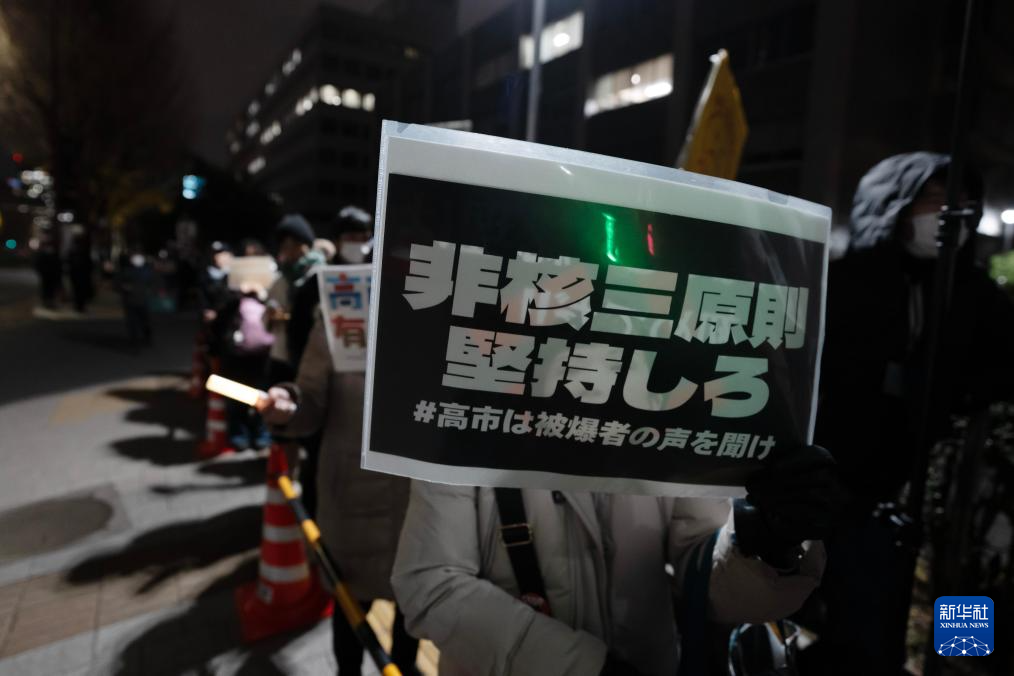 日本民众23日晚在东京首相官邸前举行抗议集会,要求首相高市早苗撤回涉台错误言论,并批评首相官邸负责安保政策的官员有关“拥核”的言论。
