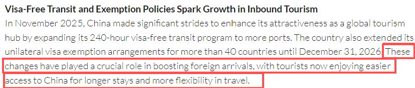 文章分析认为,2025年11月,中国将240小时过境免签政策扩大到更多口岸,并将40余国单方面免签政策延长至2026年12月31日,以增强中国作为全球旅游目的地的吸引力。这些变化在促进外国游客入境方面发挥了至关重要的作用,游客现在可以更轻松地入境中国,停留更长时间,旅行方式也更加灵活。