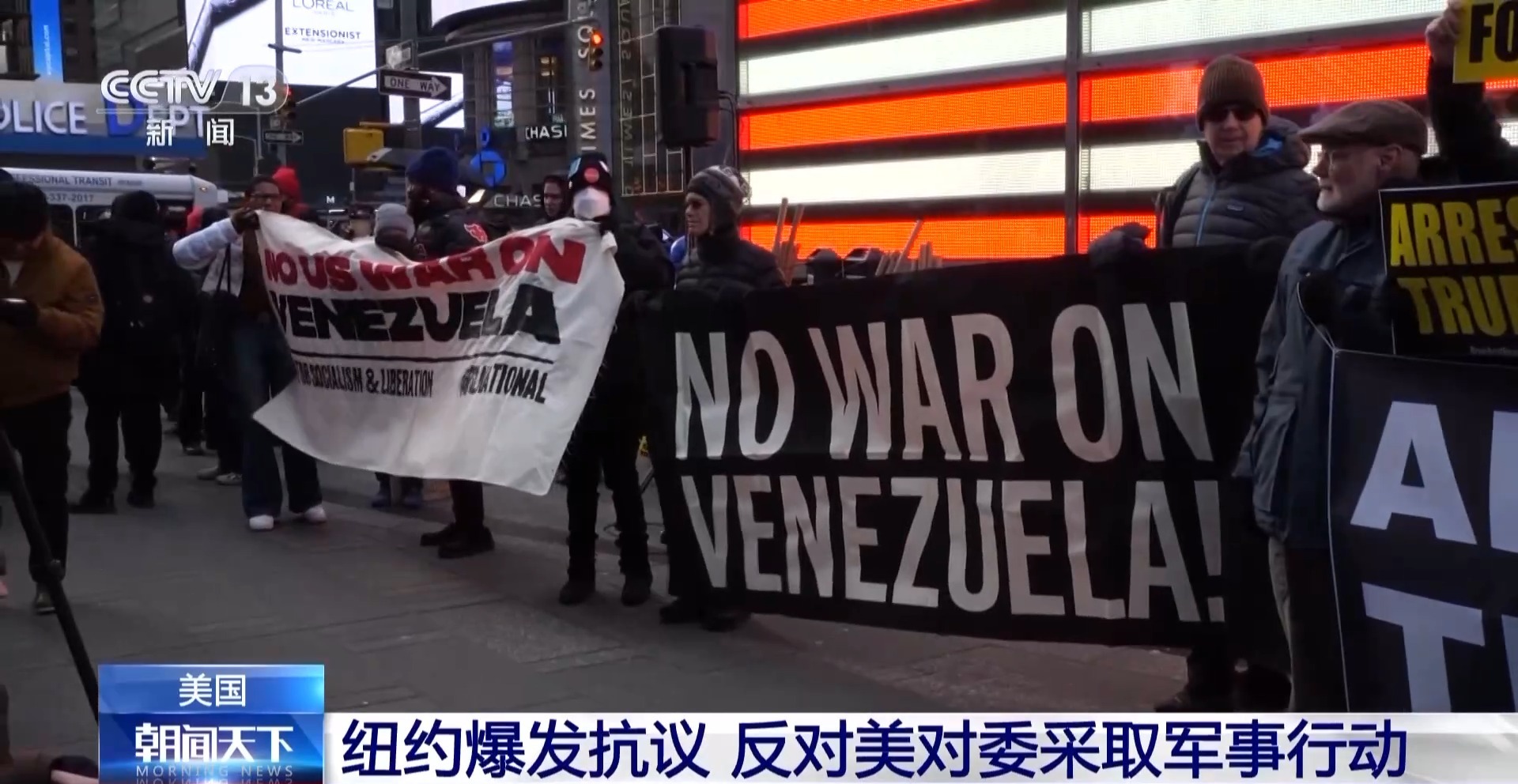 央视记者 许弢:当地时间1月3日,在美国对委内瑞拉采取军事行动后,全美多地都爆发了抗议活动。在纽约时报广场,数百人聚集在这里,反对美国对委内瑞拉采取军事干预。