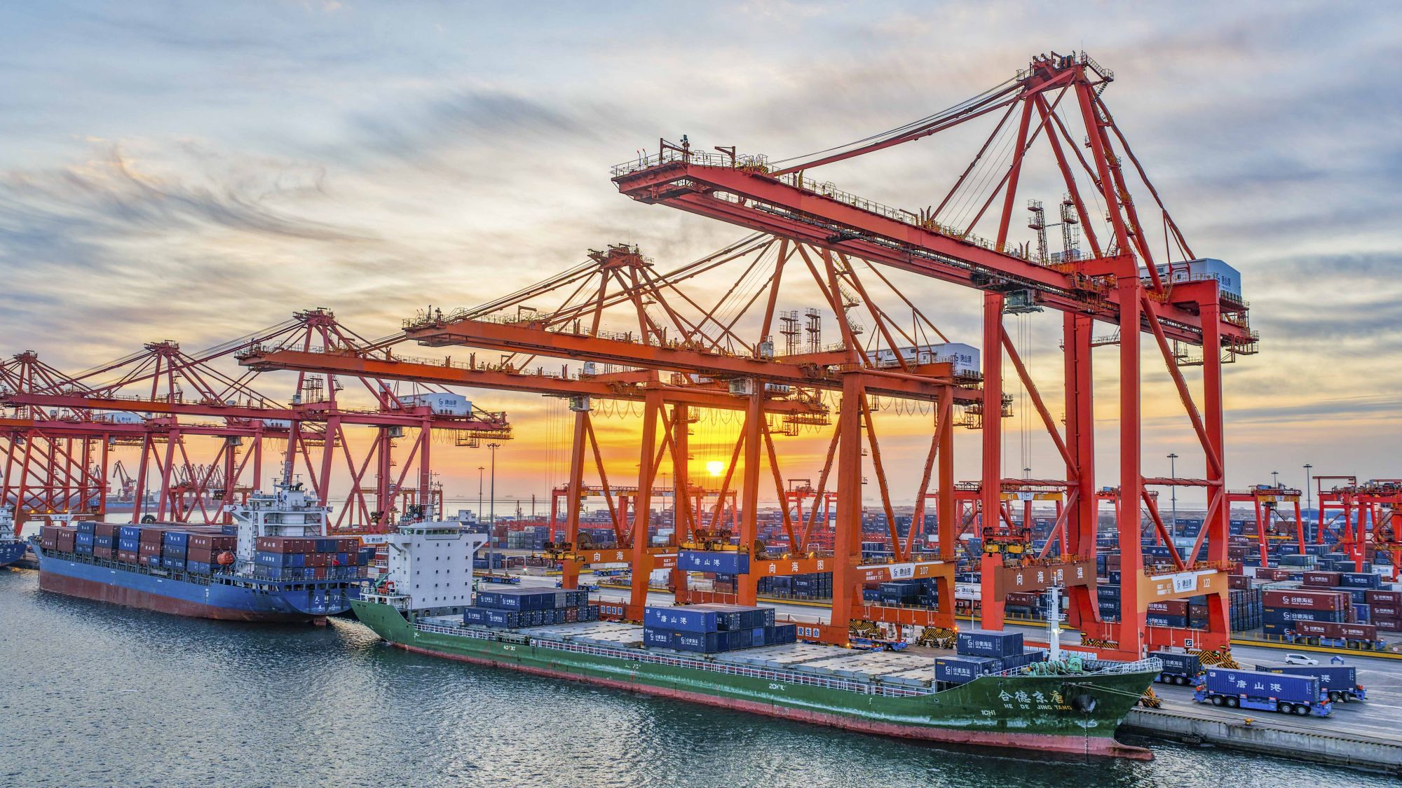 1月19日,轮船停泊在河北省唐山港京唐港区集装箱码头进行装卸作业(无人机照片)。新华社发(刘满仓摄)