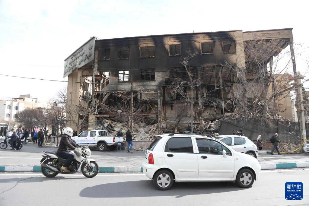 1月21日,在伊朗首都德黑兰,车辆经过在近期骚乱中受损的一处税务局建筑。新华社记者 沙达提 摄