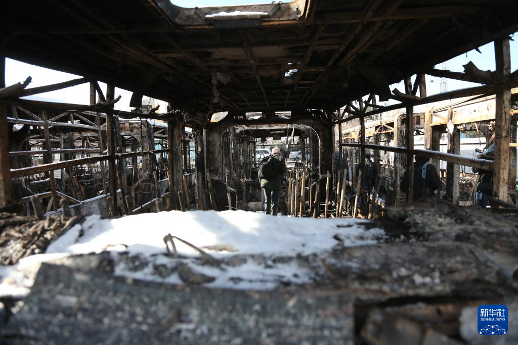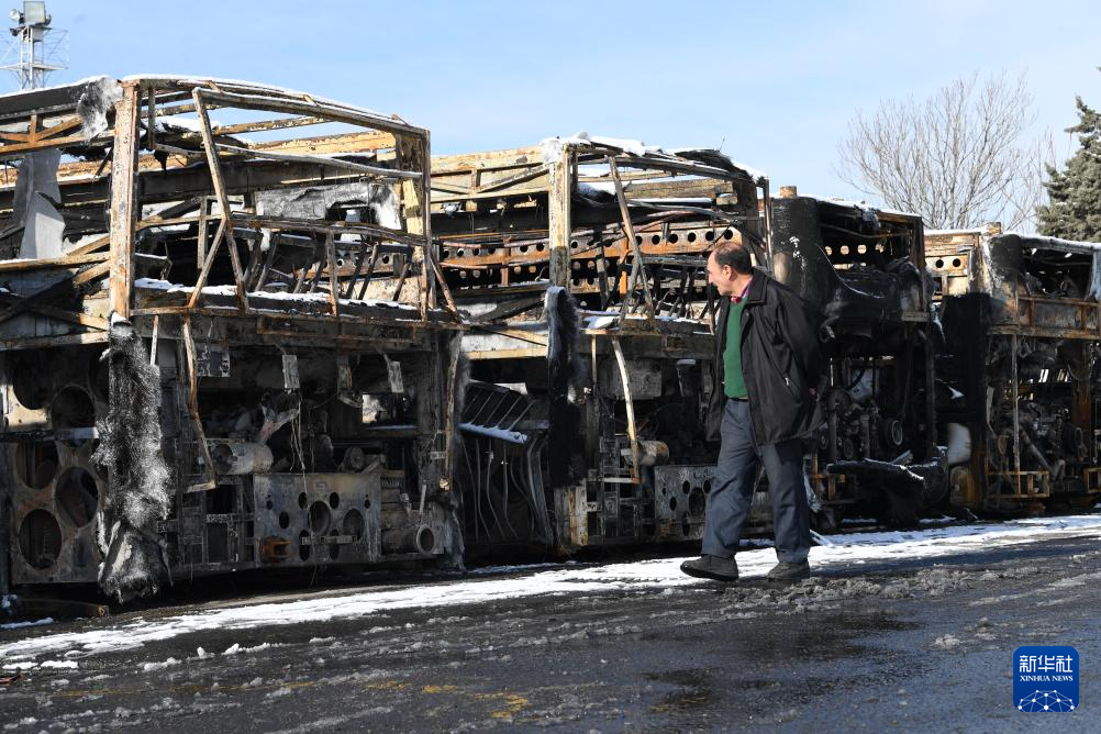 1月21日,在伊朗首都德黑兰,一名男子走过在近期骚乱中被烧毁的公交车。新华社记者 沙达提 摄