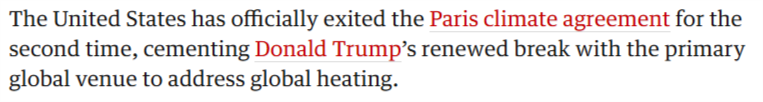 当地时间1月27日,美国退出《巴黎协定》正式生效。 这已经是美国政府第二次退出该协定。对此,英国《卫报》近日刊文称,这标志着特朗普再度背弃全球气候治理体系。