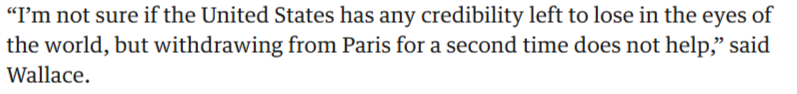 文章最后指出,美国此举也进一步强化了其作为全球政策不可靠伙伴的印象。文章引用约翰斯·霍普金斯大学中国研究教授杰里米·华莱士的话说,“我不确定美国在世界眼中是否还有任何信誉可言,但第二次退出《巴黎协定》绝不会(对提升信誉)有所帮助。”