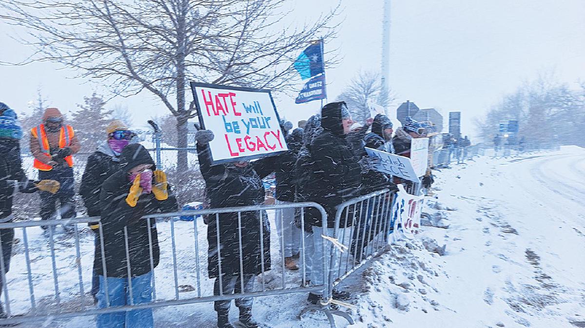 1月21日,人们在美国明尼苏达州明尼阿波利斯的惠普尔联邦大楼外抗议。美国移民与海关执法局等多个联邦机构的当地办事处都设在该大楼内。 新华社发