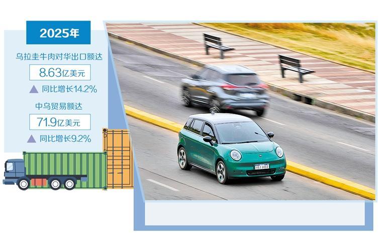今年适逢中乌建交38周年,中国已连续10余年保持乌拉圭第一大贸易伙伴地位。2023年建立全面战略伙伴关系以来,中乌双边贸易快速发展、亮点纷呈。乌拉圭的红酒、牛肉、乳制品等产品为中国消费者提供了更多选择,中国的汽车、家电、日用品等极大丰富了乌拉圭人民的物质生活。数据显示,2025年,中乌贸易额达71.9亿美元,同比增长9.2%。同年,乌拉圭豆粕和菜籽粕等新产品获得输华准入,两国农牧业合作迎来了更大空间。