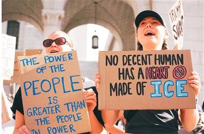 近日,民众在美国加利福尼亚州洛杉矶市政厅前手举标语参加示威活动,反对移民与海关执法局的暴力执法行动。曾 慧摄(新华社发)