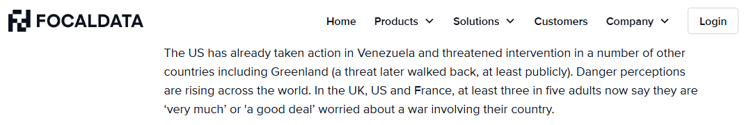 这份报告说,去年11月发布的《美国国家安全战略》,明确阐述了美国政府想要恢复其在西半球的“主导地位”。近期,美国已在委内瑞拉采取行动,并威胁干预丹麦格陵兰岛以及多个国家。全球范围内的危机感正在加剧。在英国、法国,目前至少有五分之三的成年人表示他们“非常”或“相当”担心本国卷入战争。