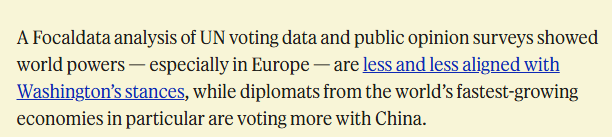 报道援引总部位于英国的数据分析和市场研究公司Focaldata的调查报告,该报告通过对联合国投票数据和民意调查的分析发现,世界大国——尤其是欧洲国家——与美国立场的契合度越来越低,而来自全球增长最快经济体的外交官们则越来越多地与中国保持一致。