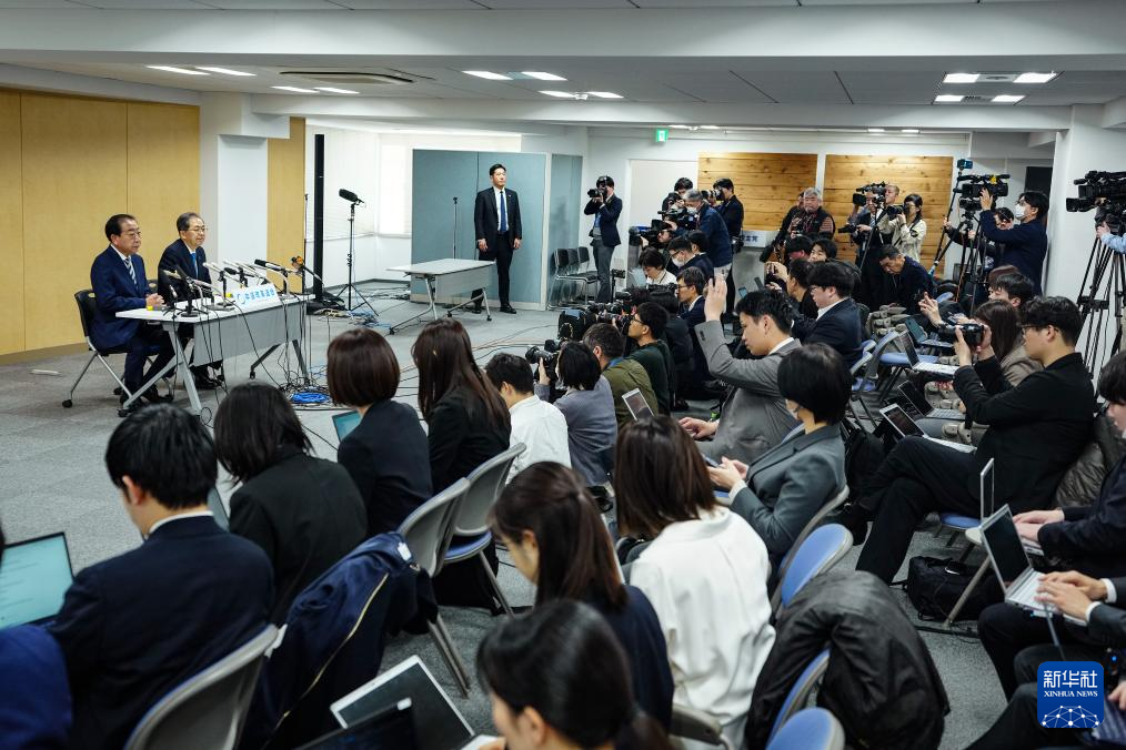 2月9日,在日本东京,日本“中道改革联合”共同代表野田佳彦(左)与齐藤铁夫出席记者会。新华社记者 贾浩成 摄