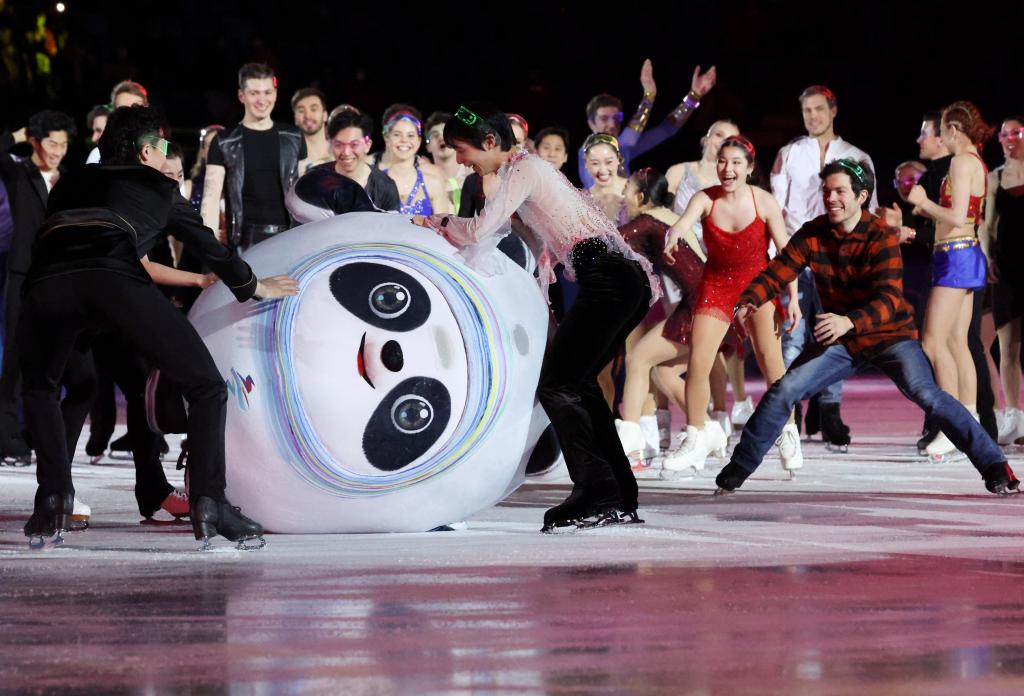 2022年2月20日,北京冬奥会花样滑冰表演滑举行,“冰墩墩”不小心摔倒后,选手们纷纷上前帮忙。新华社记者 张玉薇 摄