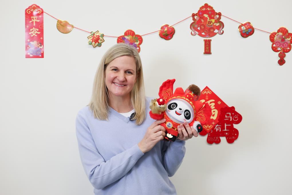 2026年2月13日,国际奥委会主席考文垂在新华社米兰冬奥会报道中心展示“马墩墩”。新华社记者 张铖 摄