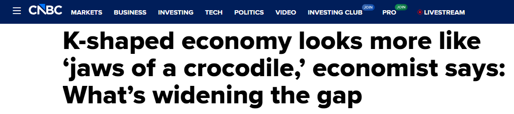 美国消费者新闻与商业频道(CNBC)援引美国银行研究所高级经济学家大卫·廷斯利的话称,美国的“K型经济”曲线正在扩大,并开始变得“更像鳄鱼的血盆大口”,裂口越拉越大,加剧社会分化。