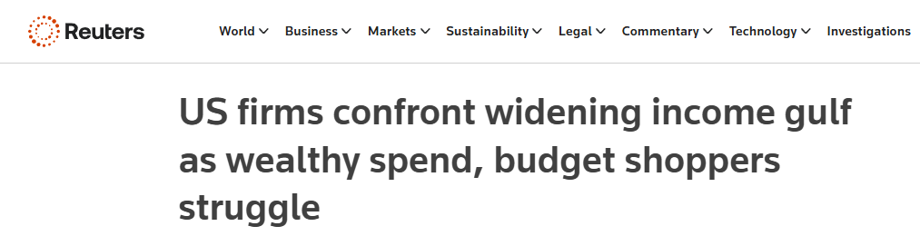 路透社报道指出,企业财报也反映出美国的“K型经济”正在加深。航空公司、奢侈品牌与高端信用卡机构的数据显示,高端客户群体消费强劲,带动利润超预期增长;与此同时,食品加工企业、快消品公司与支付平台却警告称,中低收入消费者正在削减支出、延后消费,甚至转向折扣渠道。