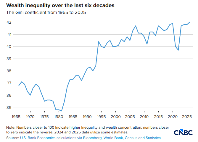美国银行本月早些时候发布的一份报告显示,用于衡量财富集中程度的关键指标——基尼系数——已升至60年来的高位。