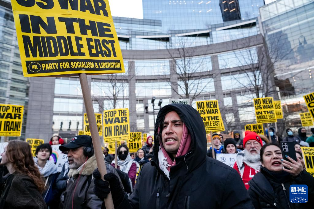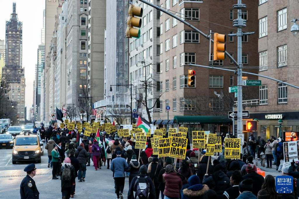 2日傍晚,数百名抗议者冒着严寒在纽约市哥伦布圆形广场集会,组织方代表发表演讲,人们手持标语,大声呼喊反战口号,要求“停止针对伊朗的战争”,随后开始游行示威。