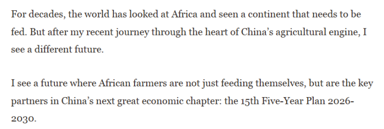 作者在探访中国河南后撰文说,数十年来,世界看待非洲的目光始终聚焦于“饥饿大陆”的标签。但当我穿越中国农业核心地带后,一个截然不同的未来图景正在浮现——非洲农民不仅能够实现粮食自给,更将成为中国“十五五”蓝图中至关重要的战略伙伴。