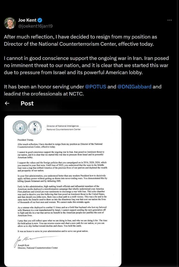 美国国家反恐中心主任乔·肯特17日宣布辞职,并在致总统特朗普的信中质疑美国军事打击伊朗的正当性,认为美国对伊朗的军事行动是迫于以色列的压力而发动。特朗普当天回应称,肯特“在安全方面软弱”,他辞职“是好事”。