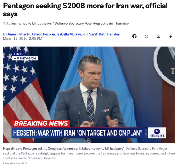 △美国广播公司(ABC)报道,国防部正寻求为对伊行动追加2000亿美元的费用。