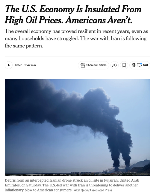 △《纽约时报》报道,对伊战争爆发以来,美国汽油价格每加仑上涨了1美元,而且几乎肯定会继续上涨,同时食品和电力价格也很可能紧随其后。