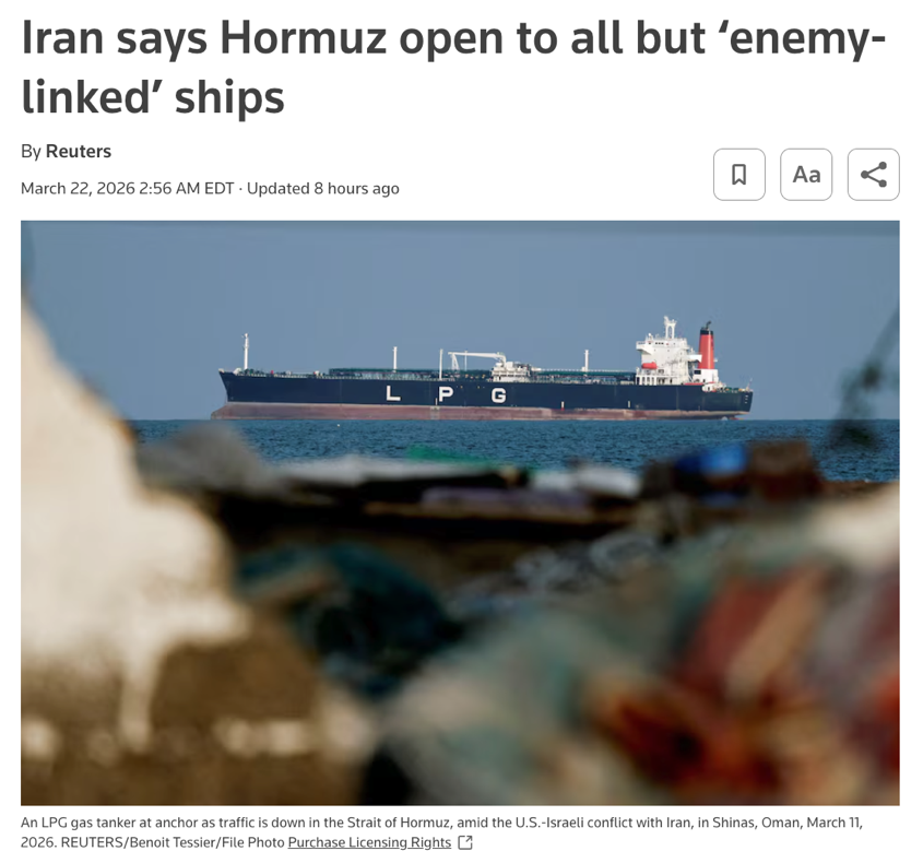 从目前消息来看,伊朗释放出的并非全面让步信号,而是一种带有明显条件限制的表态。伊朗方面22日表示,霍尔木兹海峡仍对多数船只开放,但与伊朗敌对国家有关联的船只除外。按这一口径,伊朗并没有宣布恢复“完全、无威胁”的自由通航,而是试图保留对通行对象和节奏的控制权。