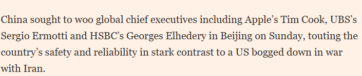 英国《金融时报》报道指出,中国在北京举行的论坛上积极吸引全球企业高管参与。在美国因对伊朗采取军事行动而陷入冲突的不确定性背景下,中国强调自身的安全性与可靠性,形成鲜明对比。