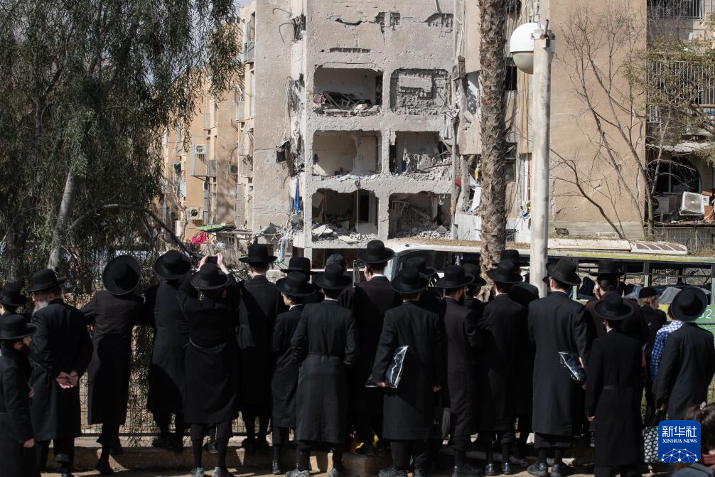 3月22日,在以色列南部城市阿拉德,当地居民查看在导弹袭击中受损的建筑。新华社记者 陈君清 摄