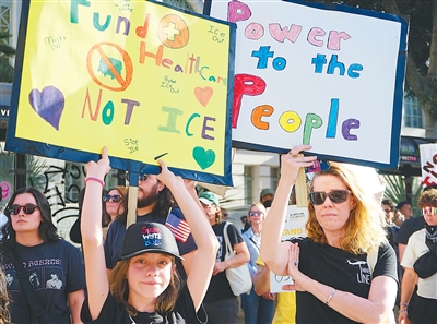 不久前,人们在美国加利福尼亚州洛杉矶市政厅前手举标语参加示威活动,抗议美国联邦当局对移民暴力执法。曾 慧摄(新华社发)