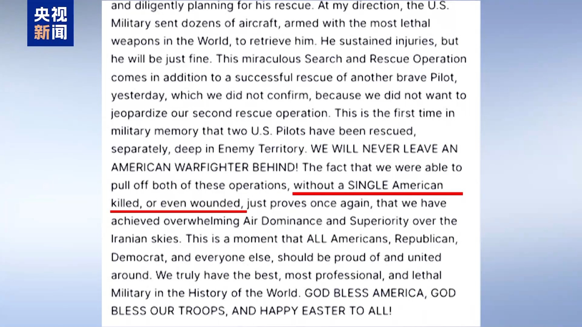 在特朗普宣布营救成功的消息后不久,伊朗方面称,美军在伊朗境内为营救被击落战斗机飞行员展开的行动 “彻底失败”,多架美军飞机被击落。