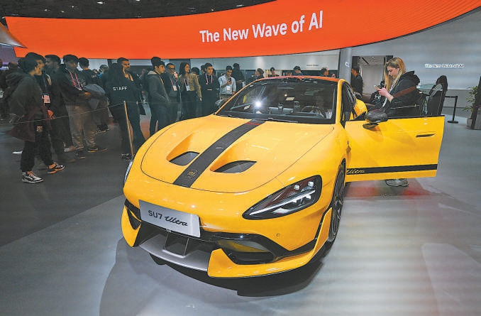 3月5日,在西班牙巴塞罗那举行的2026年世界移动通信大会上,人们参观一款小米汽车。 新华社记者 程敏摄