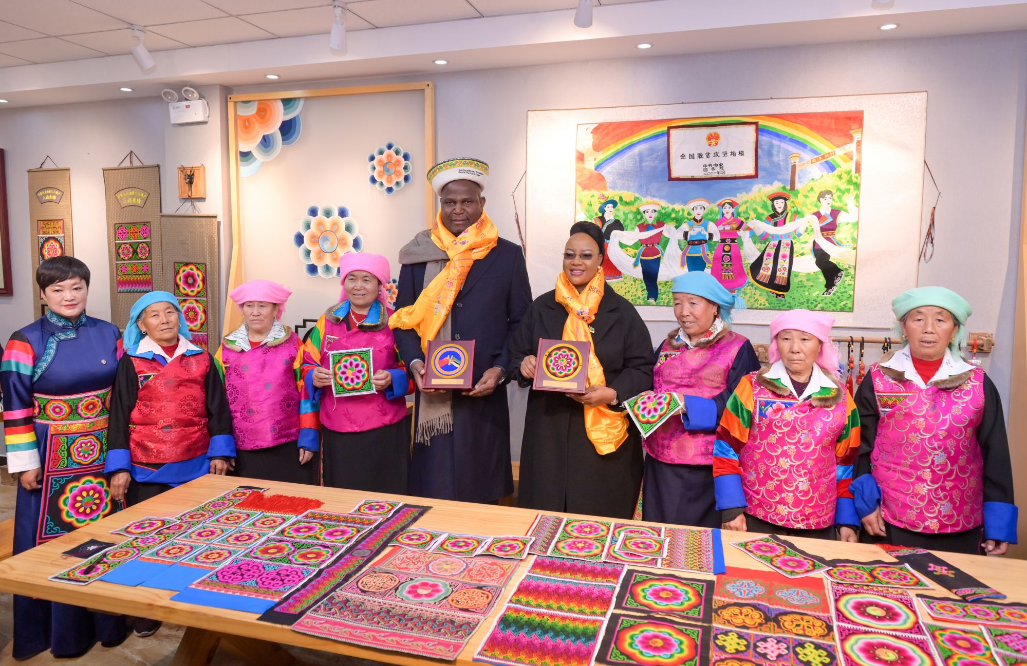 讲解员介绍,盘绣园采取“公司+基地+带头人+农户”模式,实现统一培训、统一供料、统一回收、统一销售,如今已有固定绣娘145人。